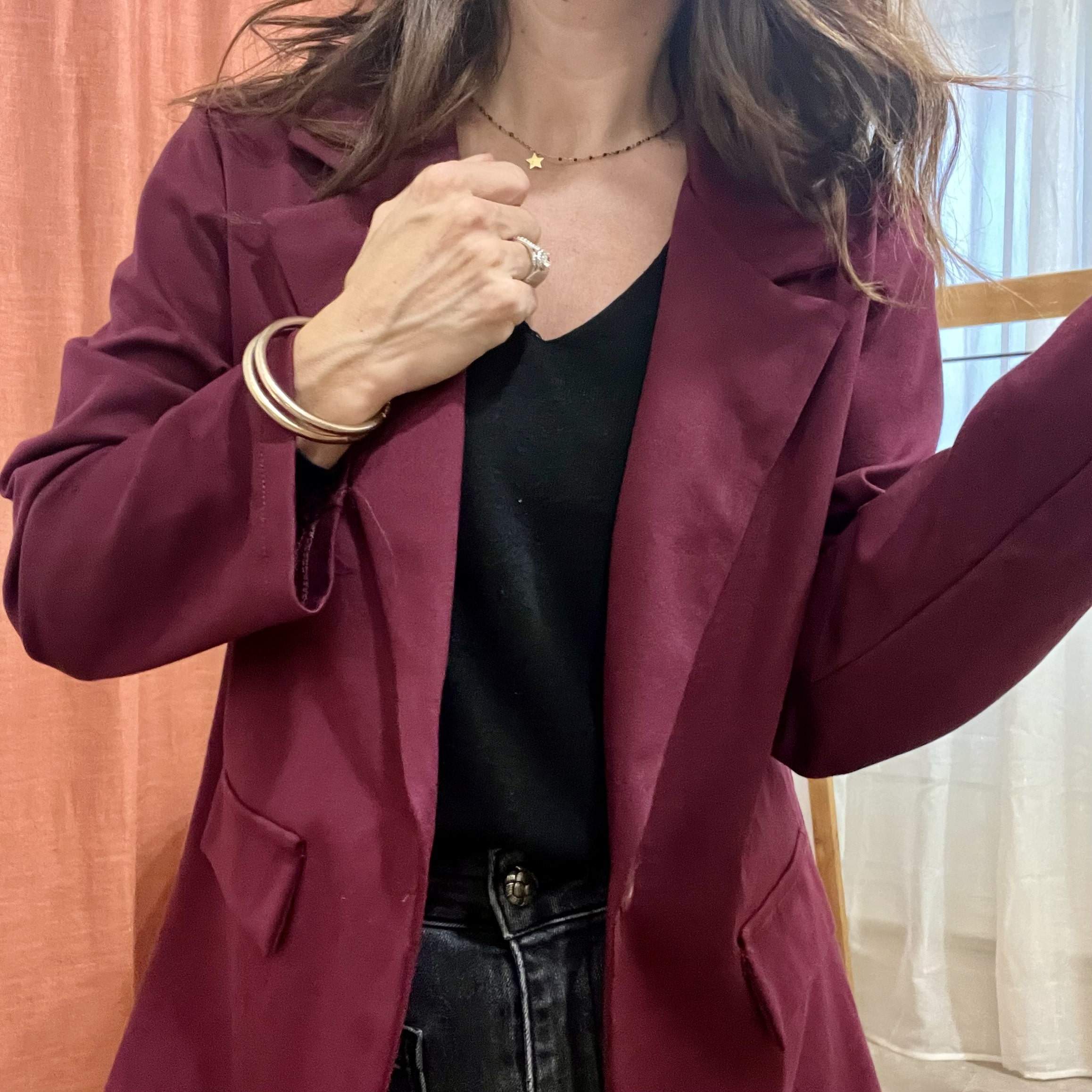 Portez le blazer MADRID aubergine avec un jean brut et un top clair pour un look casual chic.