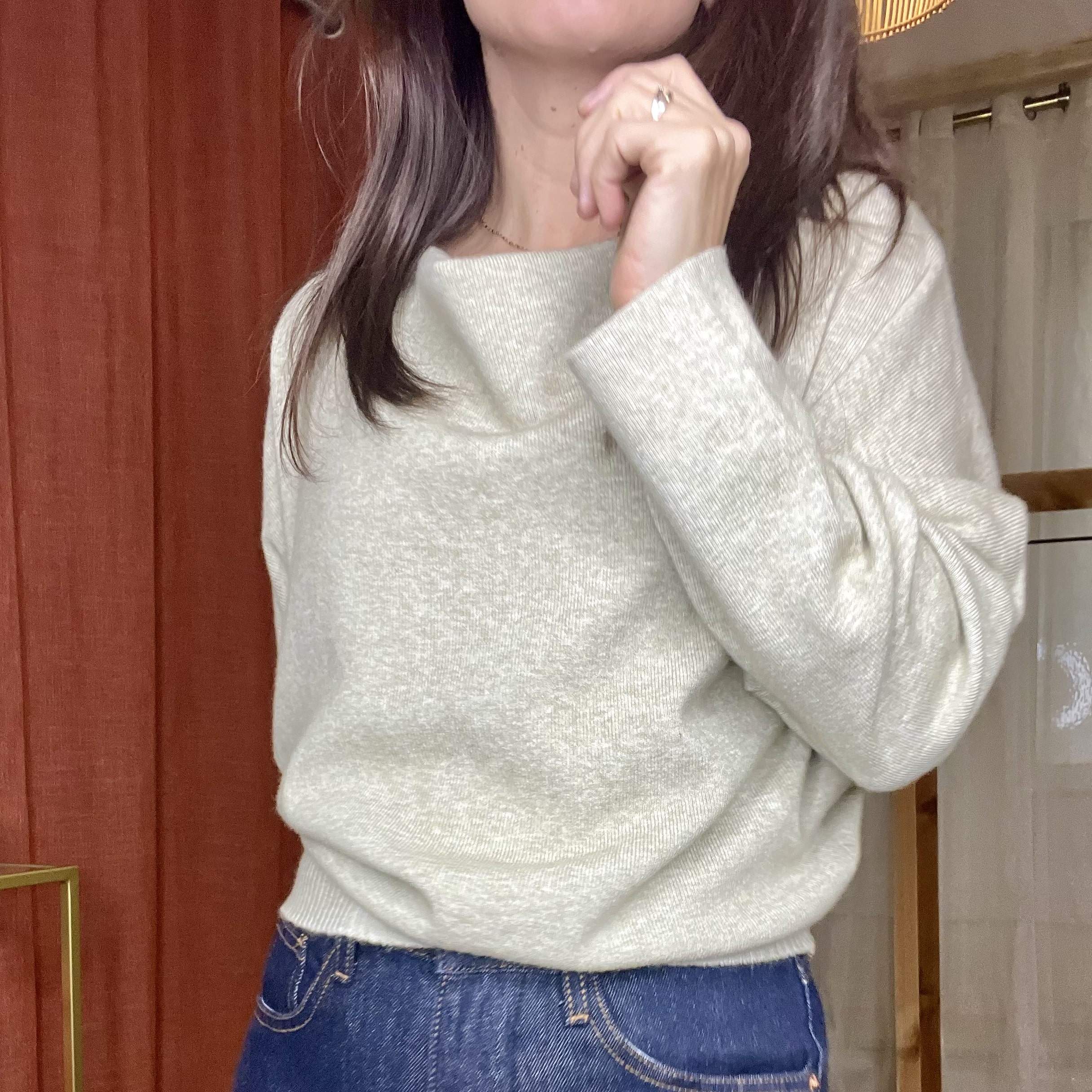 Associez le pull TERRA beige taupe à un pantalon large écru pour un total look doux et élégant.